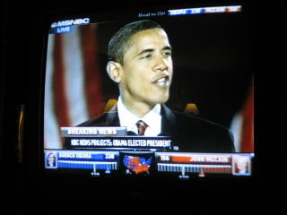 We waited for over an hour with nothing changing in the standings. It was "too close to call" in major battle states. Then the most incredible thing happened. The T.V. announcer said,"The west coast polls are closing in 10 seconds". The very next thing he said was "California is declaring that Obama has taken the state of California." The very next vision we had on T.V. was of Grant Park in Chicago with these words " President Elect Obama"