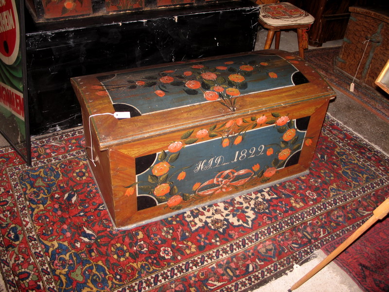 Old painted chests,oriental carpets, household items,wooden furniture,china,pottery.