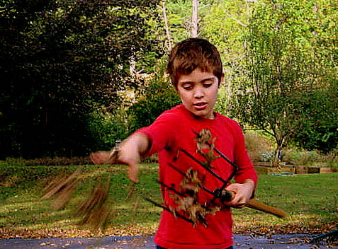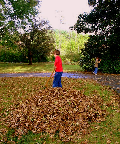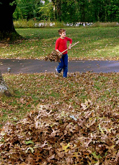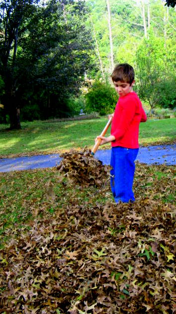 I've got the leaves mom, don't worry, I'll take care of it. And with that he did but not before having a little fun with that big pile.
