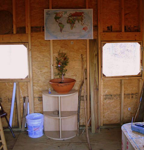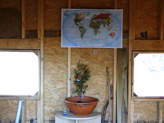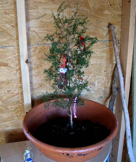 A flower pot which was immediately used. A pine seedling was dug out of the forest, complete with soil and placed in the flower pot. Helpful friends brought decorations for the living tree decor.