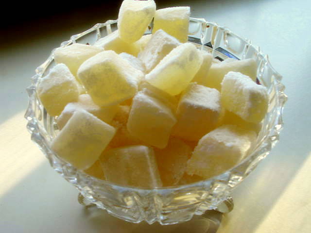 Known as “gift of the squirrels”, these lovely delights are brought to us by the gnomes’ via the squirrels. Have you ever wondered why squirrels run in front of your car almost getting killed every single time? Well they are collecting nuts, not only for winter, but to keep their energy stores up while they are making lokum. During the winter, way up in the trees, these sugar pot stirring squirrels are making next year’s lokum. It needs to age before sprinkling powdered sugar on them. Eat them as they are or squish them up and place them in between two vanilla wafers or other soft cookie to make a lokum sandwich.