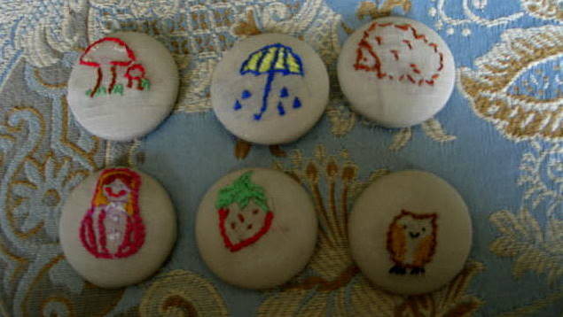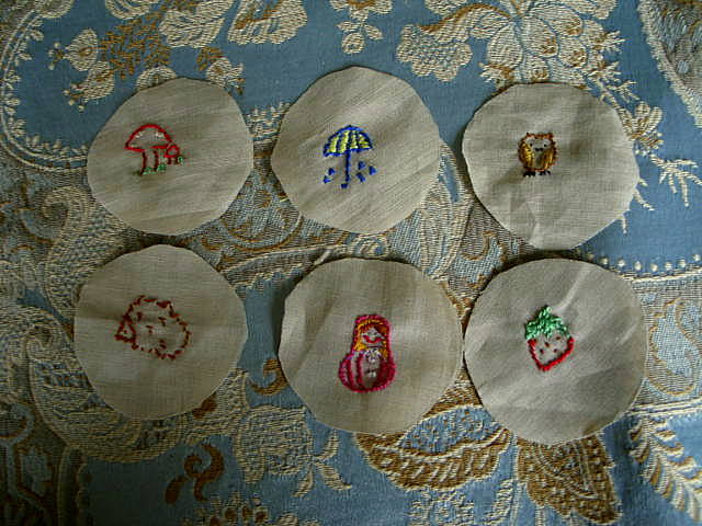 And then it happened. I drew my circles, transferred my patterns, pulled out my thread bag, and stood in my kitchen embroidering these cute little buttons. It was so relaxing and I just loved them as their little personalities appeared.