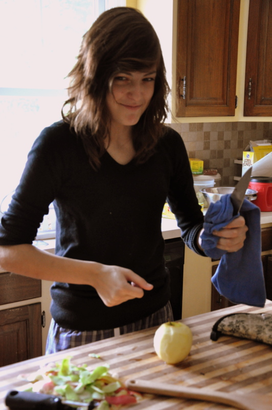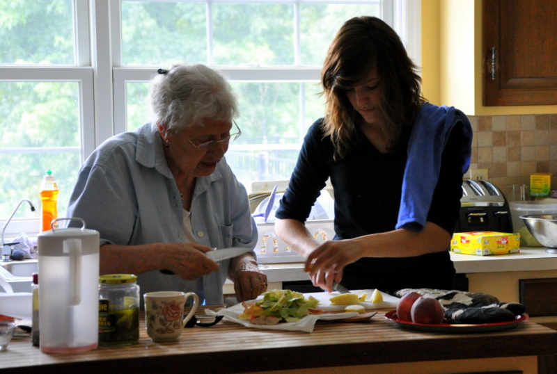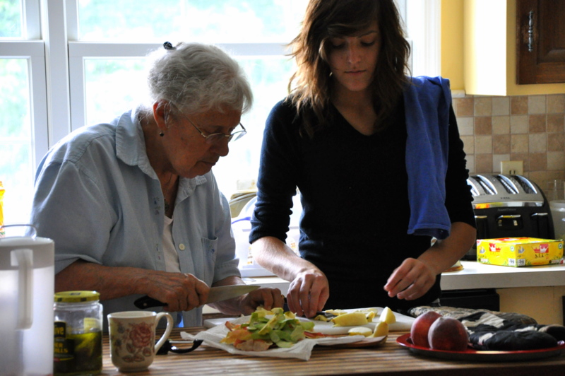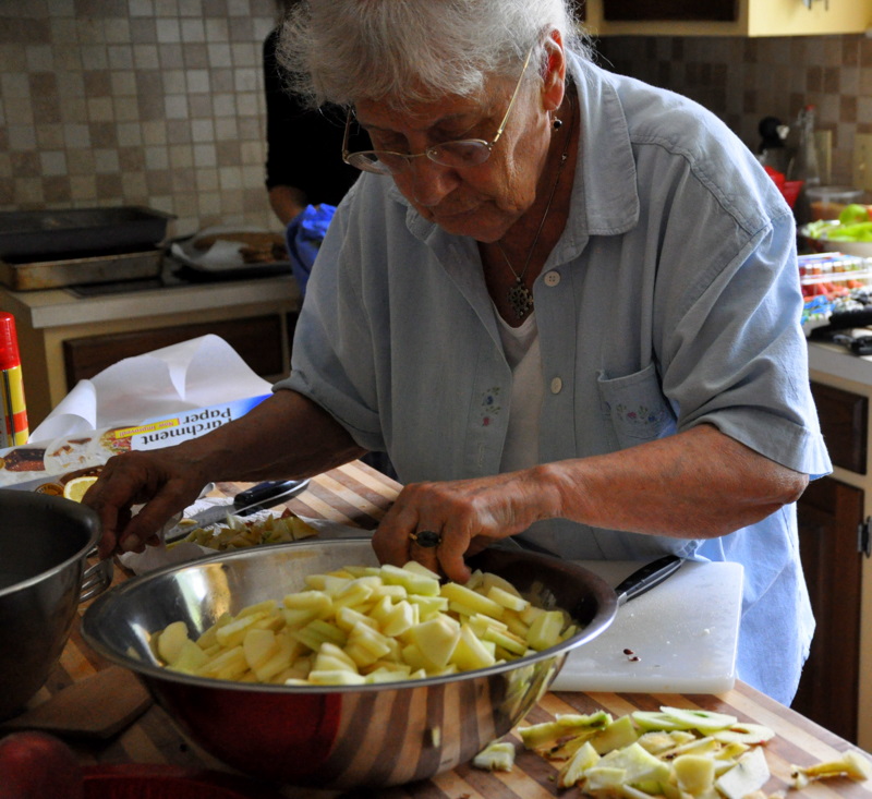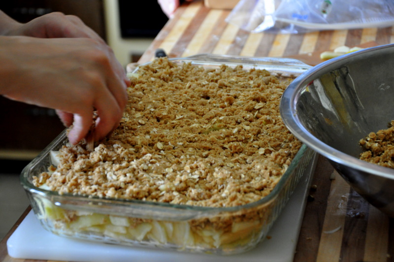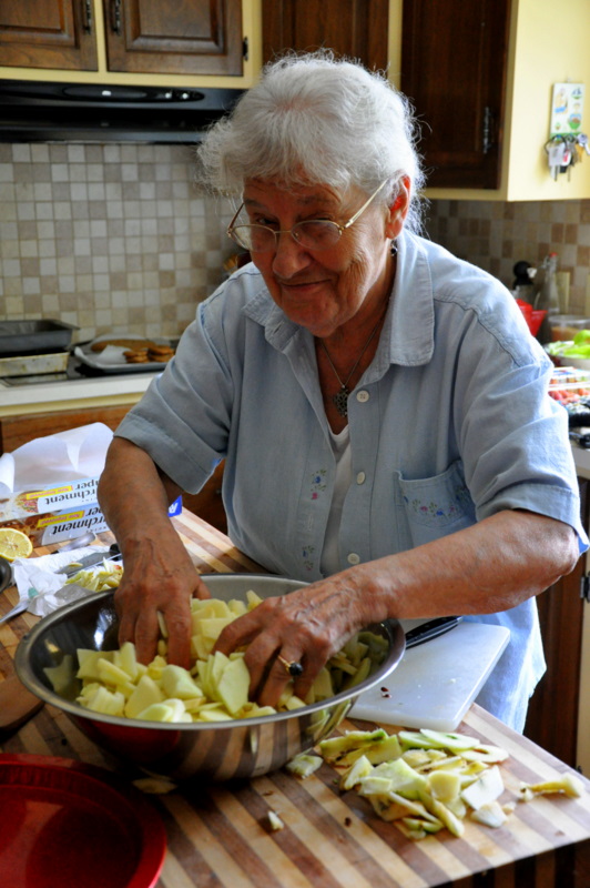 After all of the apples were peeled, a conversation ensued as to which was the better way to slice an apple for an apple crisp. Length wise or in little slices? Aunt Claire has been visiting us this past week and so she joined in the conversation and lent a helping hand.