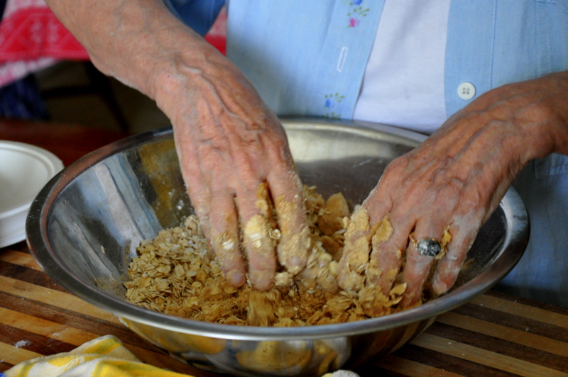 Next came the crumble part. Mimi was asking me how to cut butter into flour. I pulled out a fork and started showing her when Aunt Claire asked for the bowl and gave it her special touch. Who needs a fork when one has two perfectly good hands?