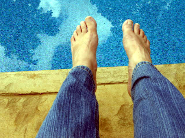 Here I sit with my feet dangling over the pool, the scent of flowers wafting through the air, the sound of bees humming around, bird song, a stack of books,my thought journal, a pen, and of course the cat.