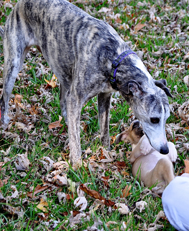 Lucy was not feeling sure at first if she would like this newcomer. Doing what dogs do best…….she rolled him.
