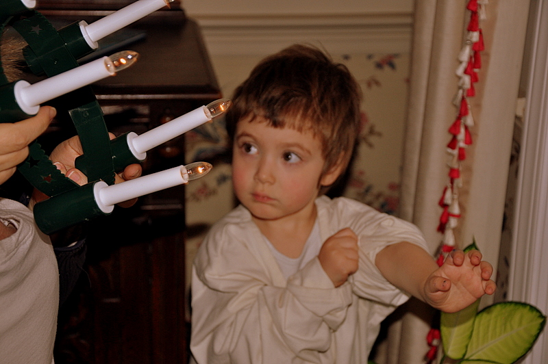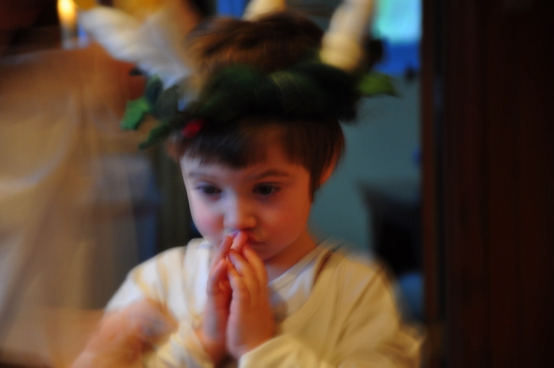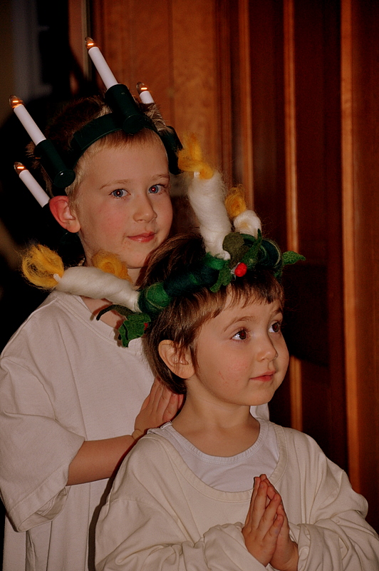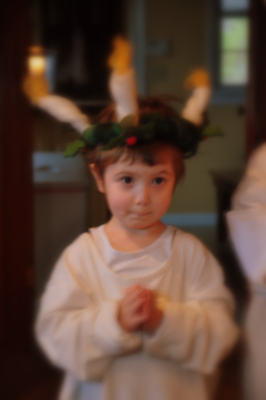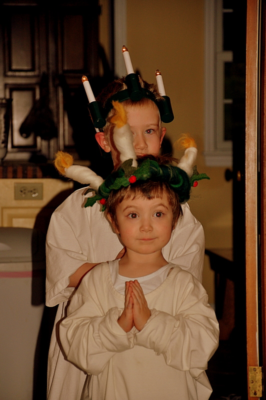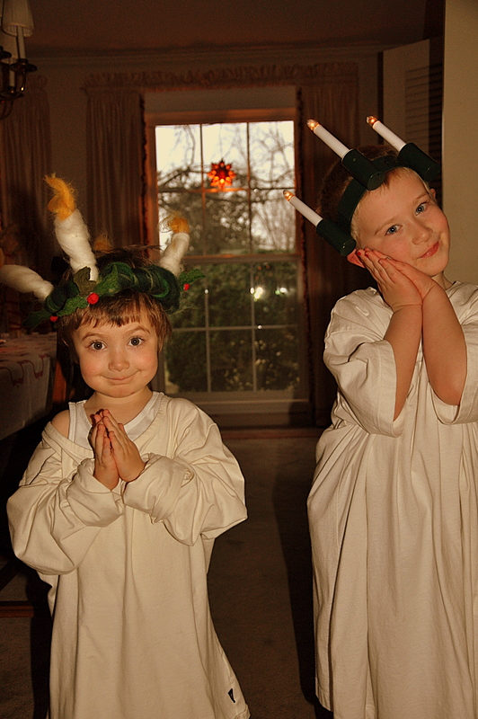 I bet you're wondering where is St. Lucia's attendants? Where are the starboys? Where are the tomte? Well……everyone is my house wants to be St. Lucia. As Georgie says, "It's Lucia Day, that means everyone gets to be Lucia." Indeed!