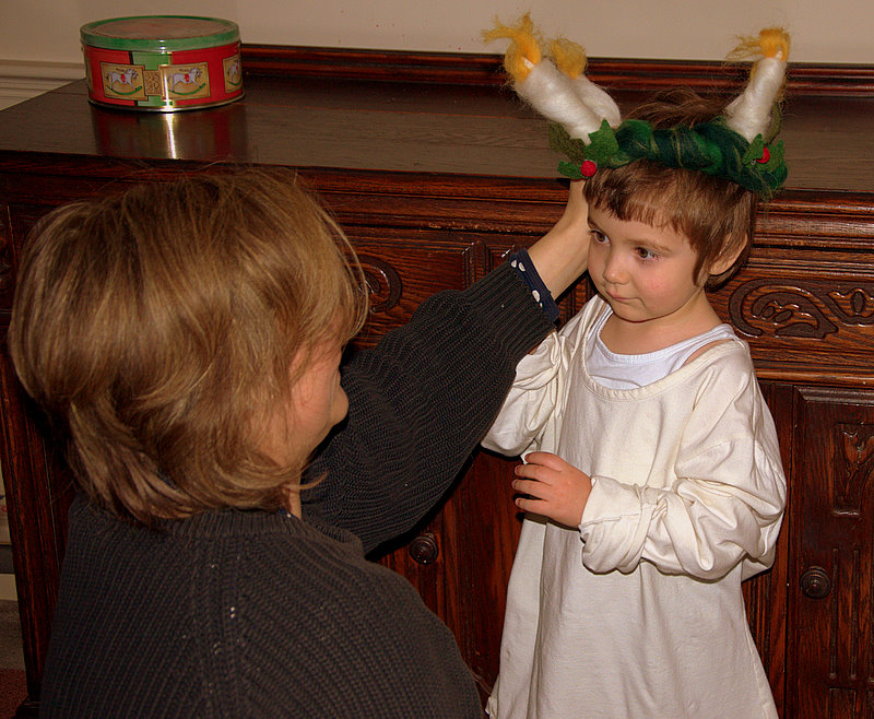 As friends arrive and listen to the story of St. Lucia, it's time to get ready for our family St. Lucia procession.