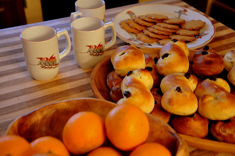 The day started early with a fresh fallen snow and I found myself in a familiar setting, my kitchen. With everyone coming over to celebrate we needed a fresh batch of lussekatter.