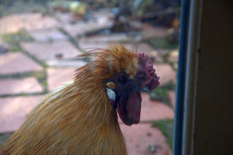 So off Emily and the boys went to work and school. I sat at the kitchen table writing and reviewing an article when I heard this tapping on the glass door. As I looked over Ginger the rooster was looking at me. (Yea that's right, a guy named Ginger. It's one of those baby chicken stories where a guy who's thought to be a chicken ends up a rooster. This is a very common occurrence in the poultry world.)
