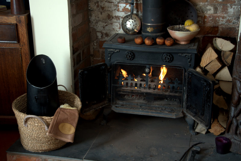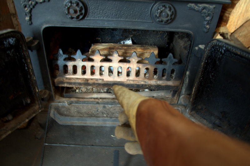"All you have to do is keep adding wood to the fire but not too much wood or the smoke stack will catch fire. If you think you have the fire going too well just shut the doors and turn the latch and it will calm right down. I'll leave you this gauntlet so you won't burn yourself on the screen or doors."