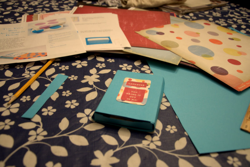 My chosen craft was the book in a sliding box project. I decided this would be a great way to use the myriad of paper I have laying around the house and it would give me the opportunity to make something for my girls.