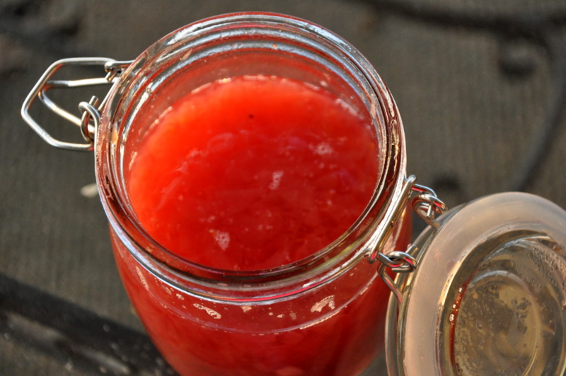 Bring to a boil and continue to boil for about 15 minutes until the mixture thickens. If you have a candy or jam thermometer, cook and stir until the jam reaches 221F or 105 C. Remove from heat and stir in one box of pectin. Place in a steril and warm jar.