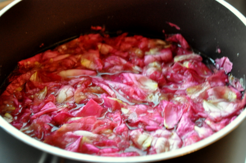 Place the remaining sugar, water, and lemon juice in a saucepan. dissolve contents over a low heat. Stir the rose petals into the mixture and allow to simmer 20 minutes.