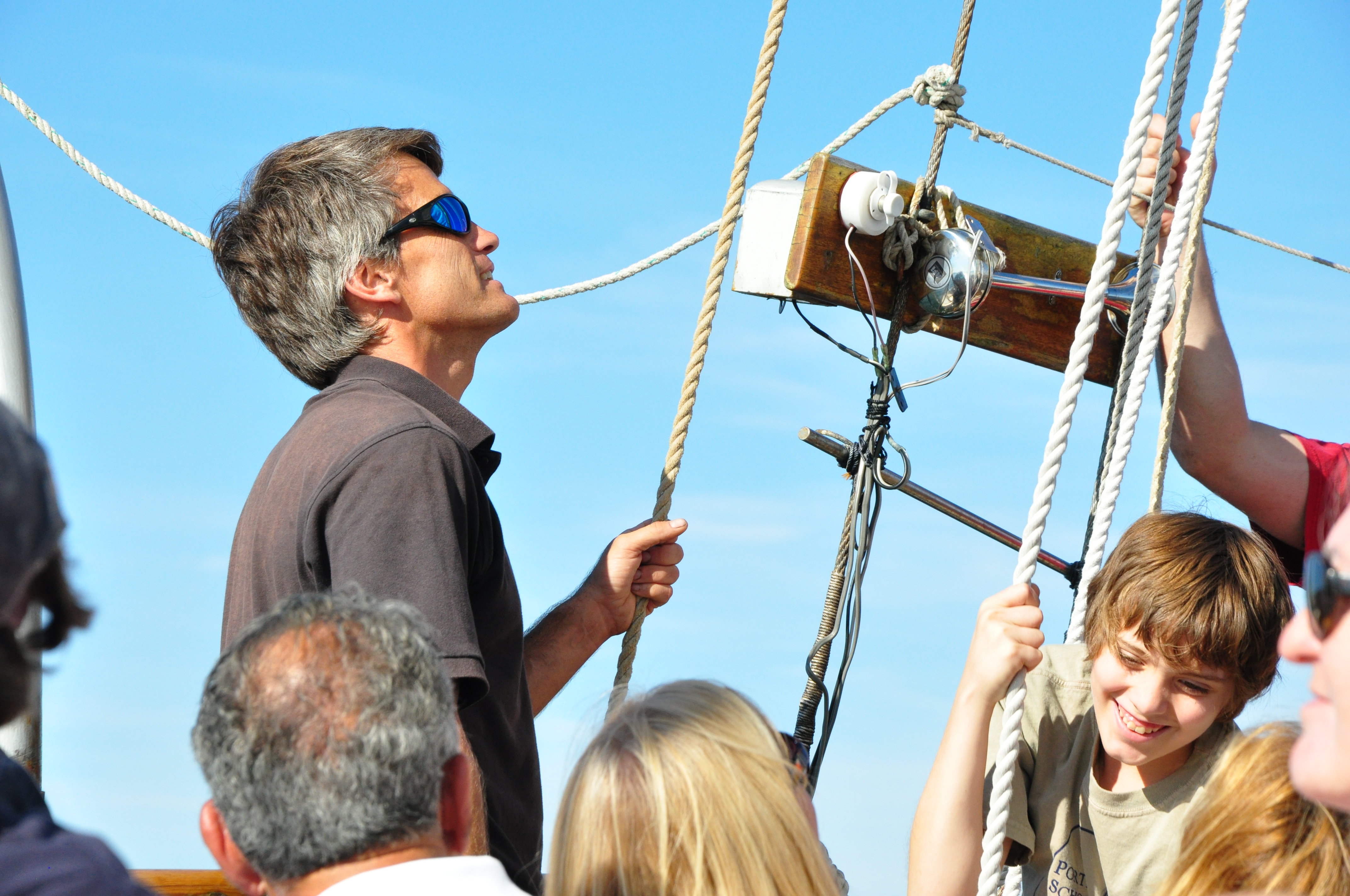 Quickly "O" got up to help Tommy hoist the sail. Hand over hand with hard pull down.